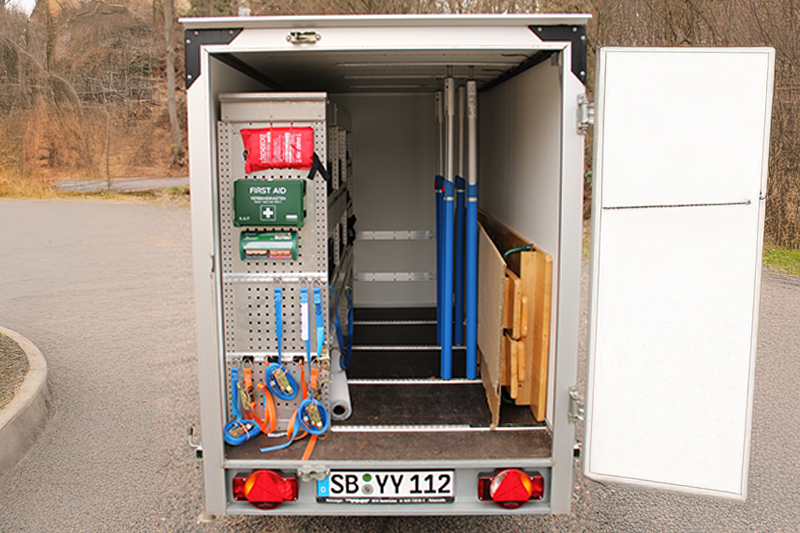 Auf dem Spieleanhänger ist alles praktisch verstaut und ihr habt sogar noch Platz eigene Materialien damit zu transportieren. Zu eurer Sicherheit findet ihr einen Erste-Hilfe-Kasten, eine Pflasterbox und eine Löschdecke. Für die Gemütlichkeit gibt es auch noch eine Biertischgarnitur.